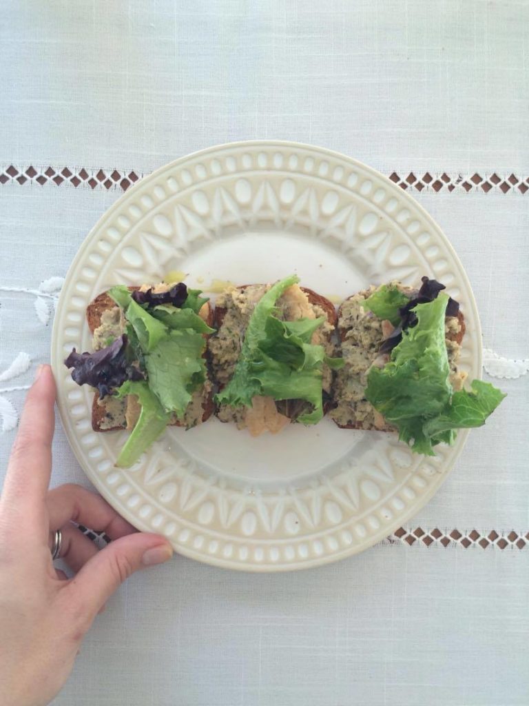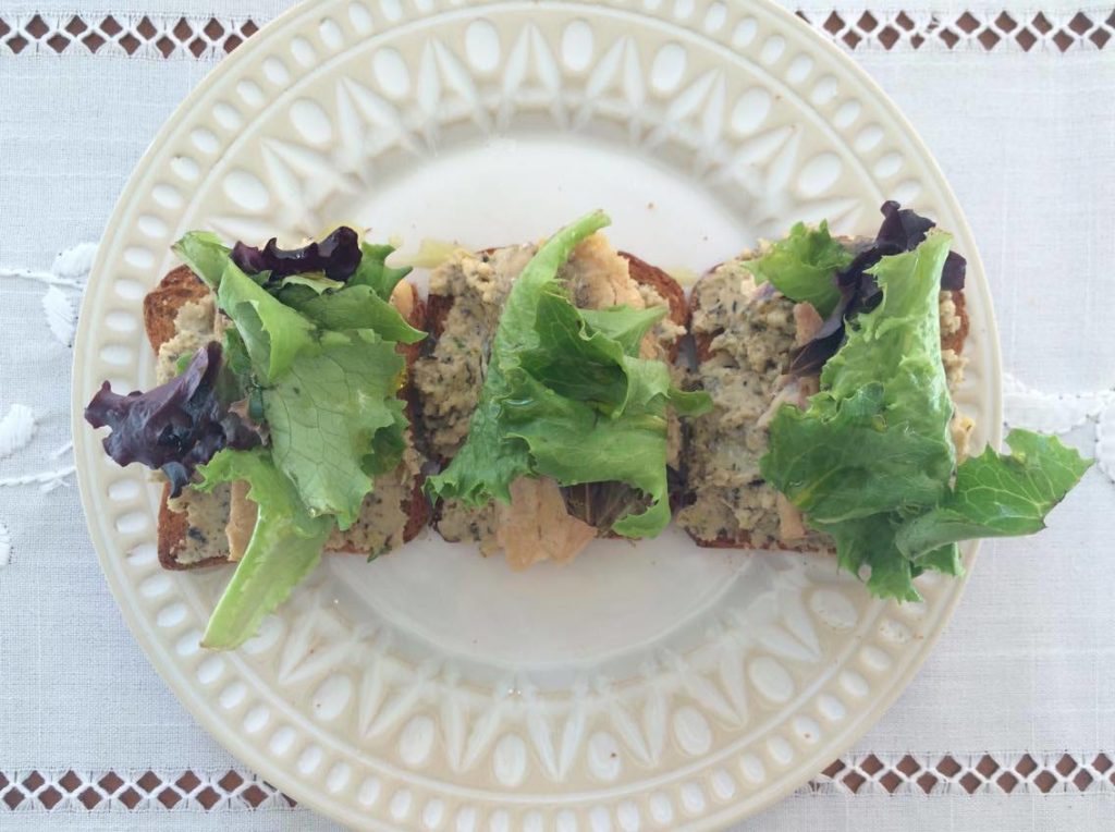 hummus de azeitona nas tostas, sobreponha com o filete de sardinha por cima e algumas