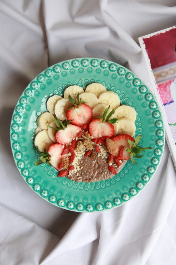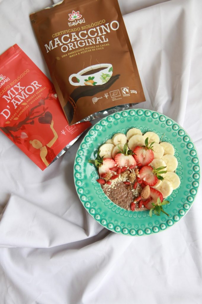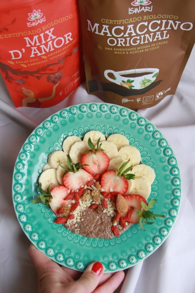 Olá meus queridos! Hoje trago-vos mais uma ideia de um pequeno-almoço super nutritivo e energético, ideal para quem vai ter um dia ativo ou fazer exercício a seguir. Só nesta refeição tinha 4 superalimentos: maca, cacau, sementes de chia e bagas de goji! Usei um produto da Iswari que eu adoro, o Macaccino (cacau, maca e açúcar de coco) para fazer a base, e o Mix de amor (bagas inca, bagas de goji e amêndoas) para o topping. Ficou absolutamente delicioso e satisfez a minha gula por chocolate sem pecado ahah.