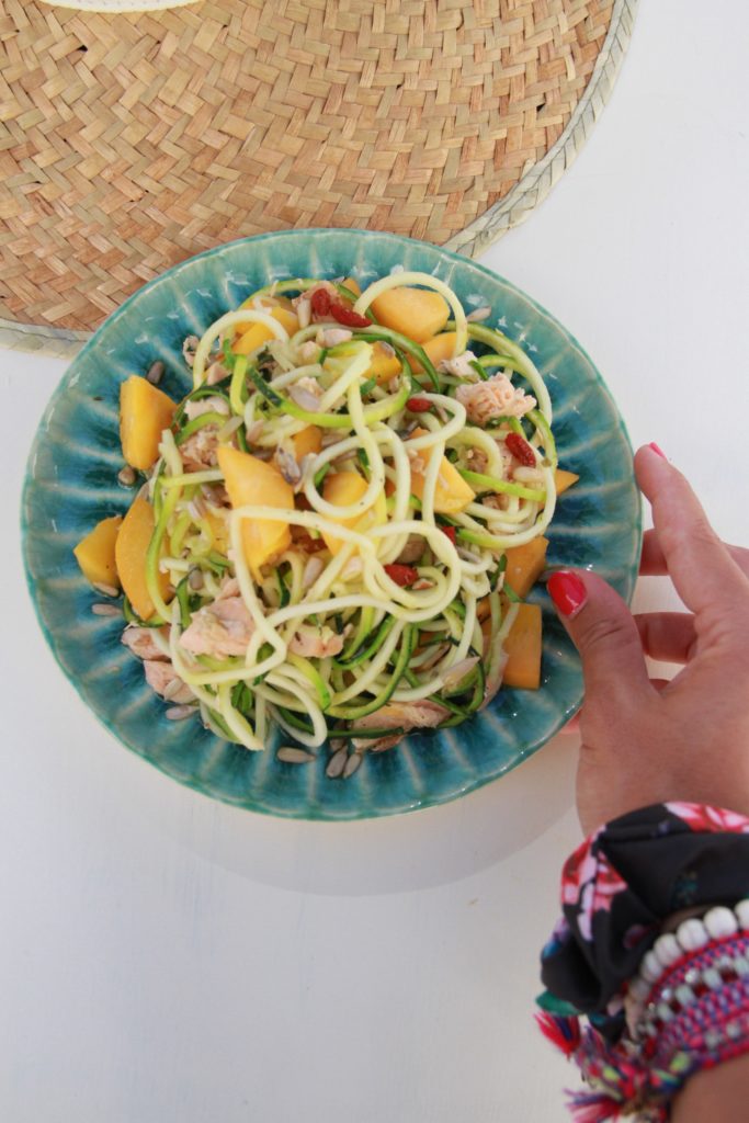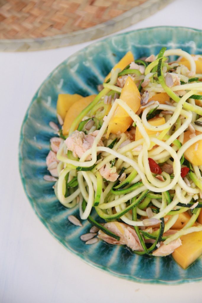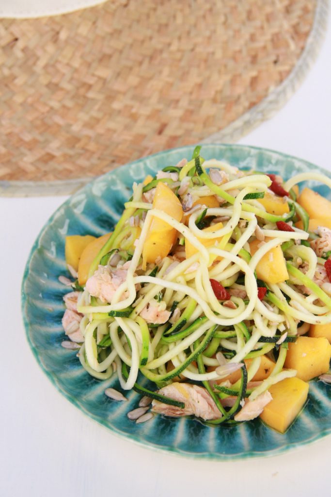 Adoro levar saladas e snacks frescos para a praia. Estas férias resolvi fazer umas experiências com o esparguete de curgete e os restos dos jantares cá de casa, neste caso o salmão assado. Misturei com pêssego, salteeie e posso-vos dizer que o resultado ficou delicioso. Super fresquinho e com o crocante das sementes. Para este post coloquei num prato mas, quem acompanha o meu instagram, já deve ter reparado nos recipientes que levo com um garfo e um frasquinho para o molho que dão um jeitão para levar para a praia ou para o escritório! (passando a publicidade, tenho um do pingo doce e um do continente)