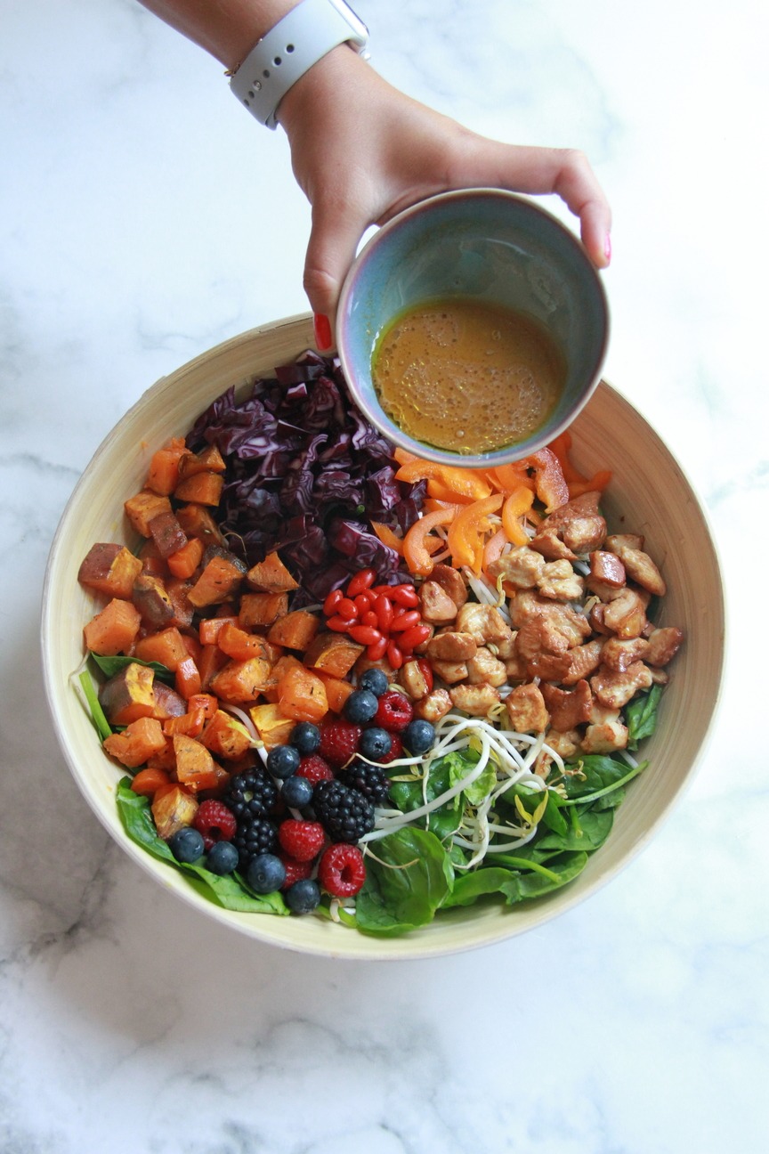 - Colocar as folhas de espinafres numa taça de servir e juntar a couve roxa e o pimento fatiados. Quando a batata doce e a cenoura estiverem prontas, juntar à salada. Adicionar os frutos vermelhos e as bagas goji.