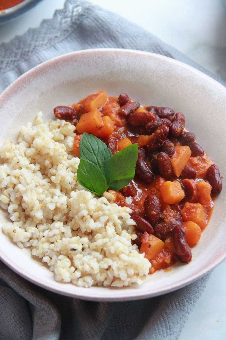Estufado de feijão vermelho com abóbora e arroz integral – vegan