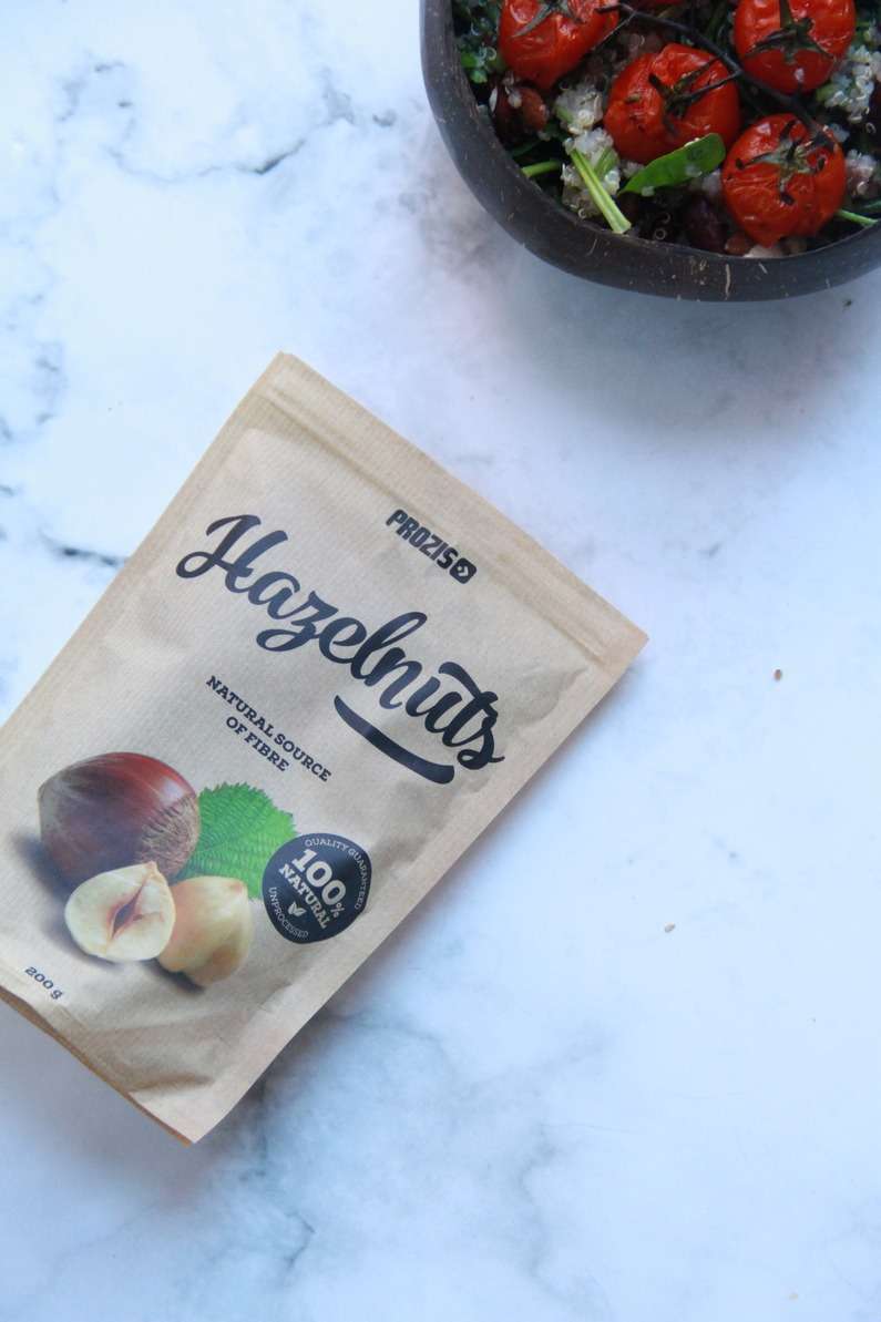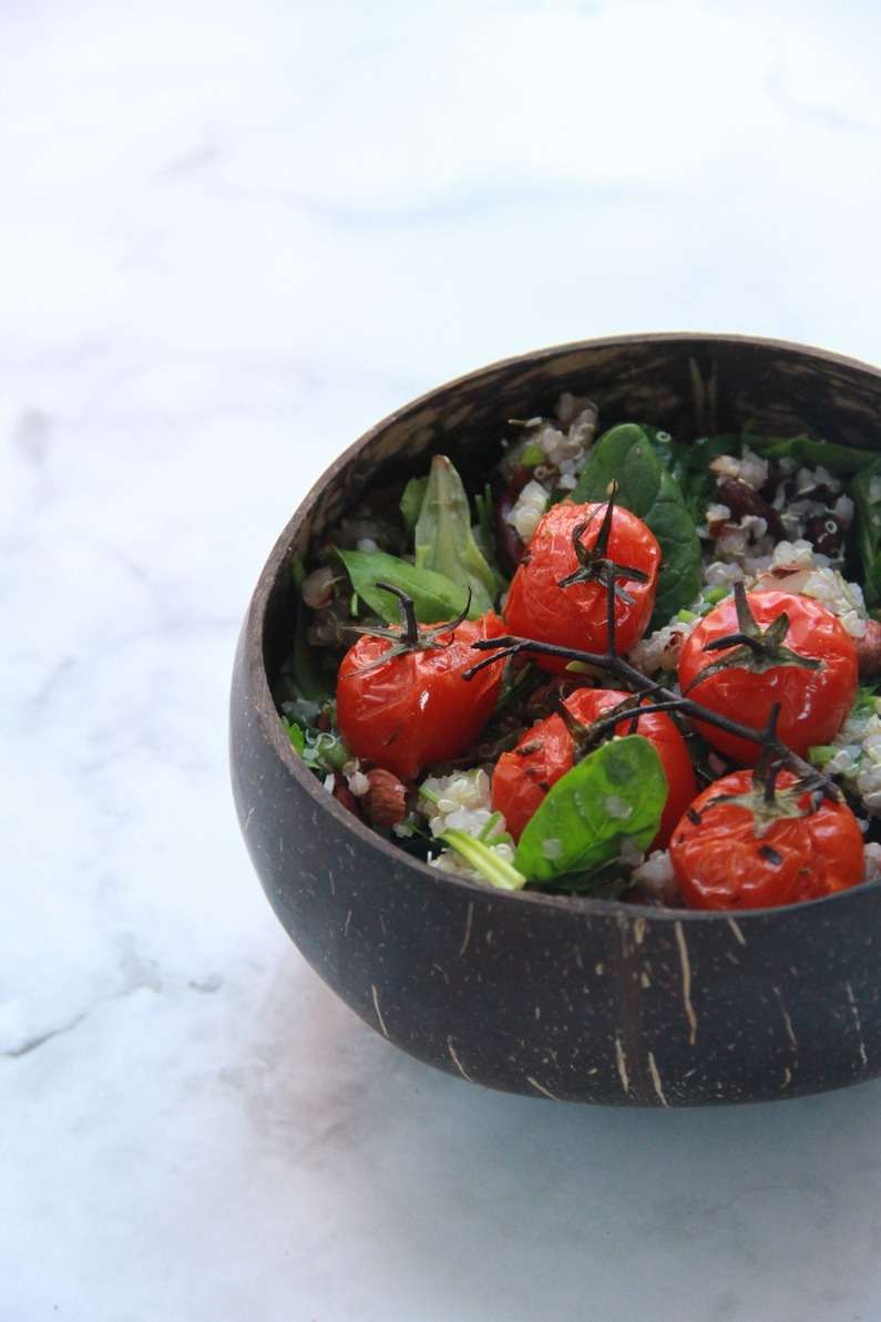 - Numa saladeira misture a quinoa, o feijão, os espinafres, a alface cortada em pedaços grandes, as avelãs picadas e os coentros picados.