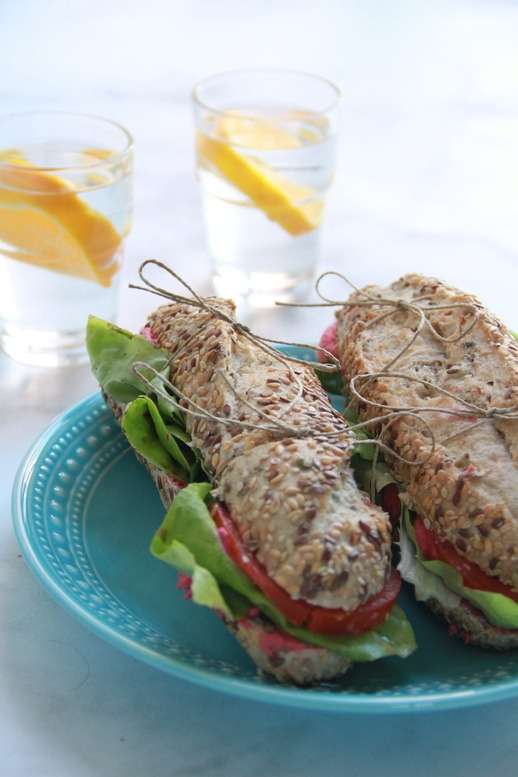 Sandes de hummus rosa com manjericão