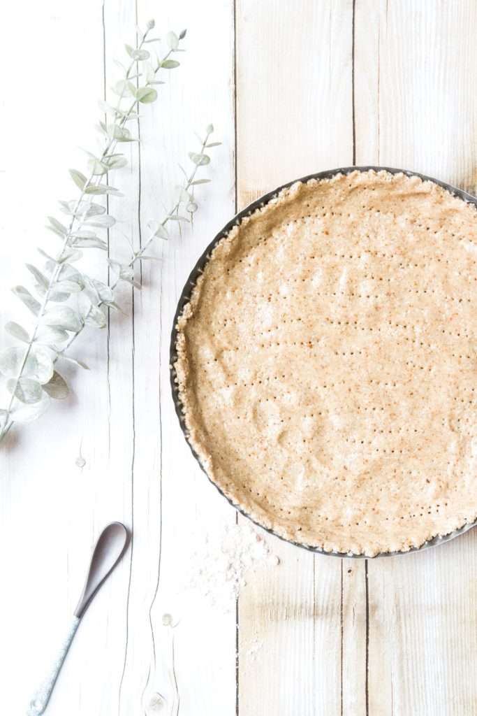 - Forrar uma tarteira com a massa calcando bem os cantos. Picar toda a superfície com um garfo.