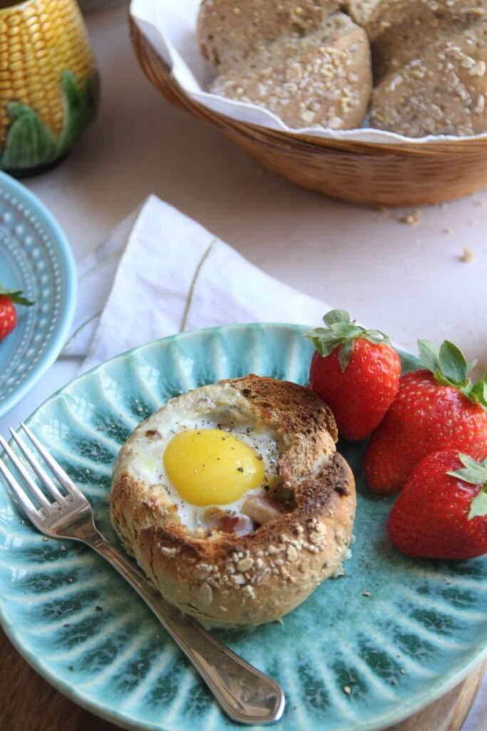 - Parta um ovo com cuidado para dentro de cara pão. Polvilhe com um bocadinho de sal e pimenta preta e leve ao forno 10 minutos a 180C, ou até que a clara fique completamente branca.