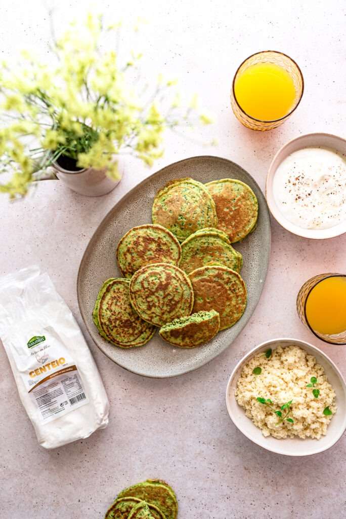 5. Sirva as panquecas de grão e espinafres com o couscous de laranja e o molho de iogurte e limão.