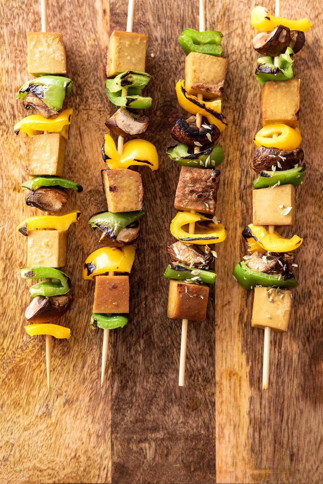 3. Depois de marinar, coloque os legumes e o tofu nas espetadas intercalando como preferir e leve a grelhar num grelhador até ficar dourado de cada lado.