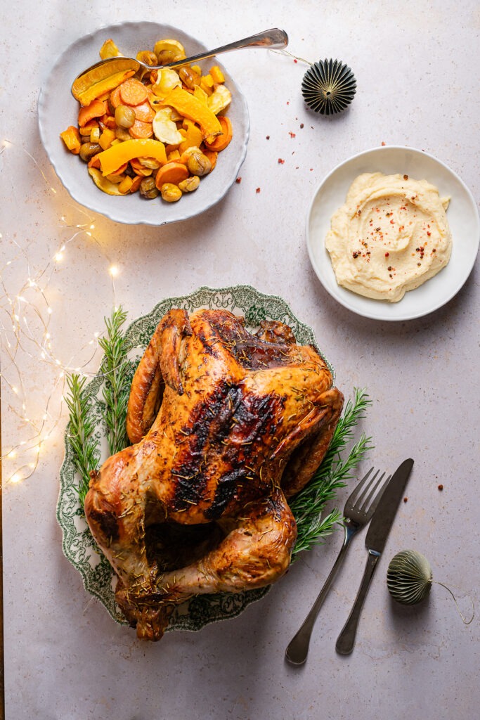 - Sirva o peru juntamente com o puré de marmelo e os legumes assados no forno.