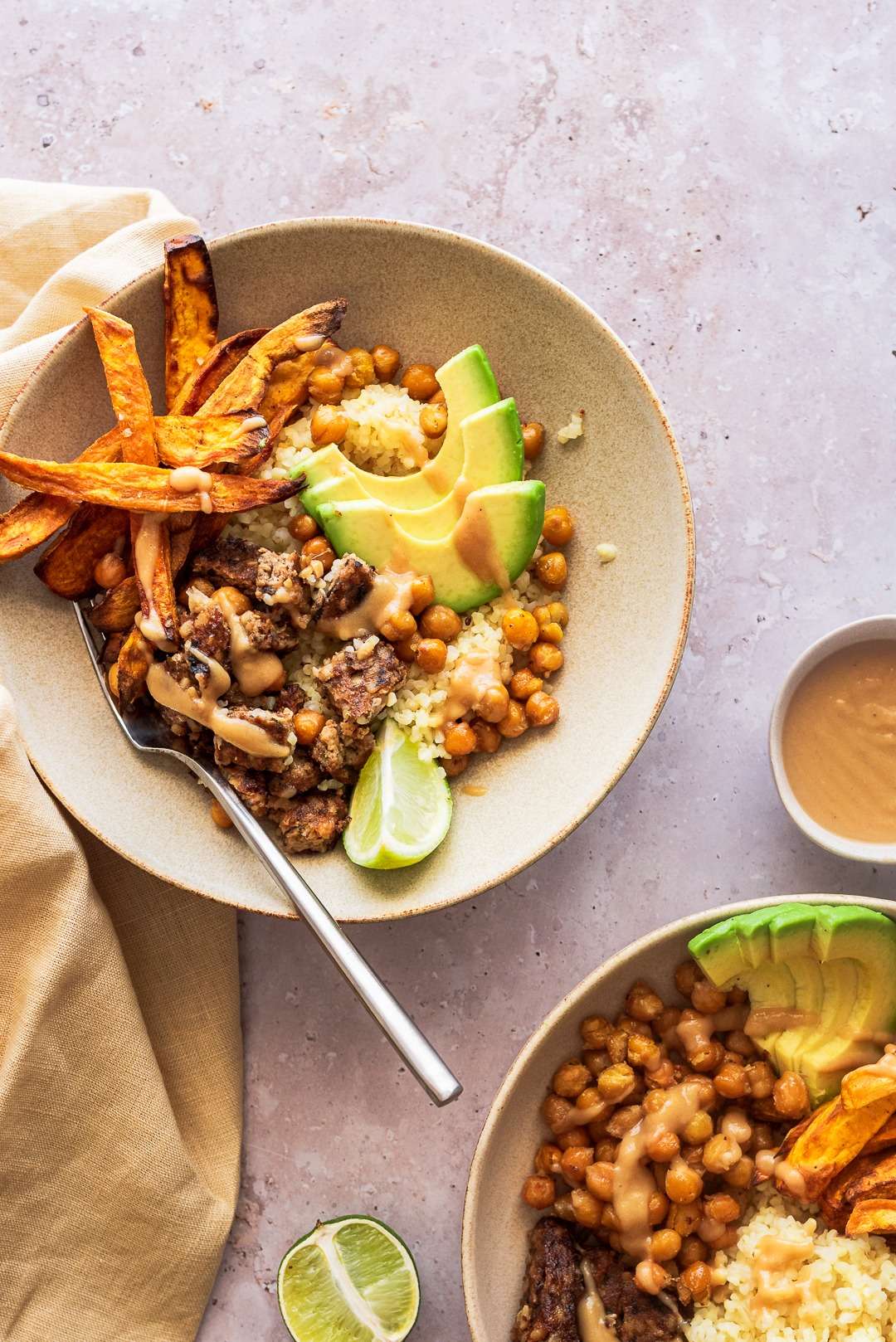 Bowl de hambúrguer de tofu e cogumelos com palitos de batata doce, grão de bico tostado, abacate e molho de manteiga de amendoim Serve 4 pessoas Ingredientes • 2 hambúrguere