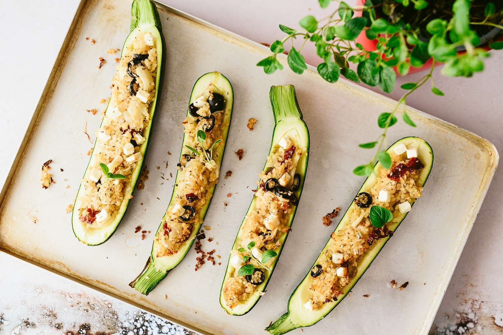 Curgete recheada com quinoa Serve 2 pessoas Ingredientes • 2 curgetes médias • Sal Rosa, Salutem • 1 chávena de quinoa (cozida de acordo com as instruções da embalagem)