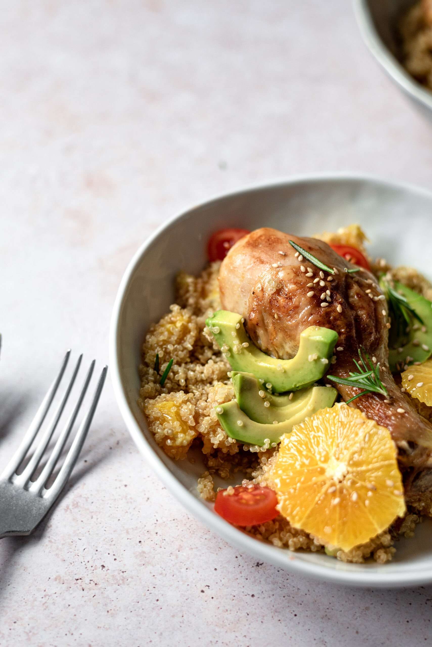Para 2 pessoas Ingredientes • 2 pernas de frango • 2 dentes de alho • 2 colheres de sopa de sementes de sésamo, Salutem • Azeite, q.b. • Sumo de limão, q.b. • Sal e P