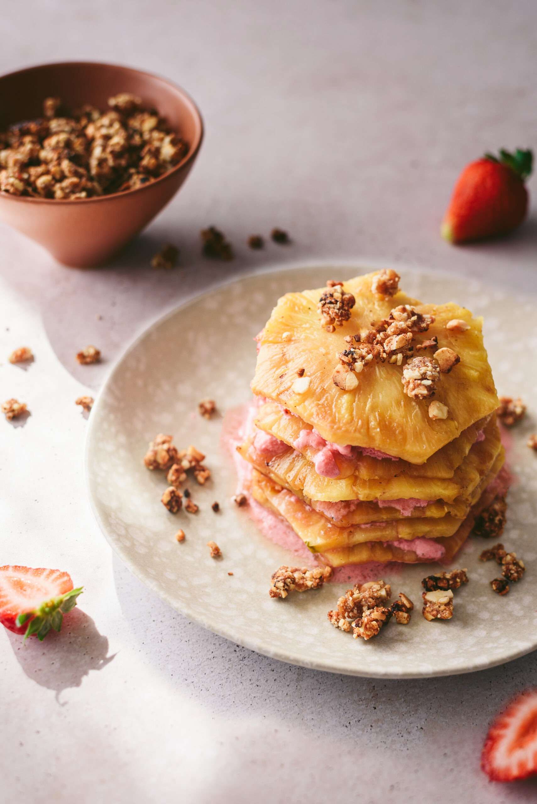 Milfolhas de ananás com creme de morango e crocante de amêndoa Para 4 pessoas Ingredientes Meio ananás ou abacaxi cortado em fatias fininhas Para o creme de morango